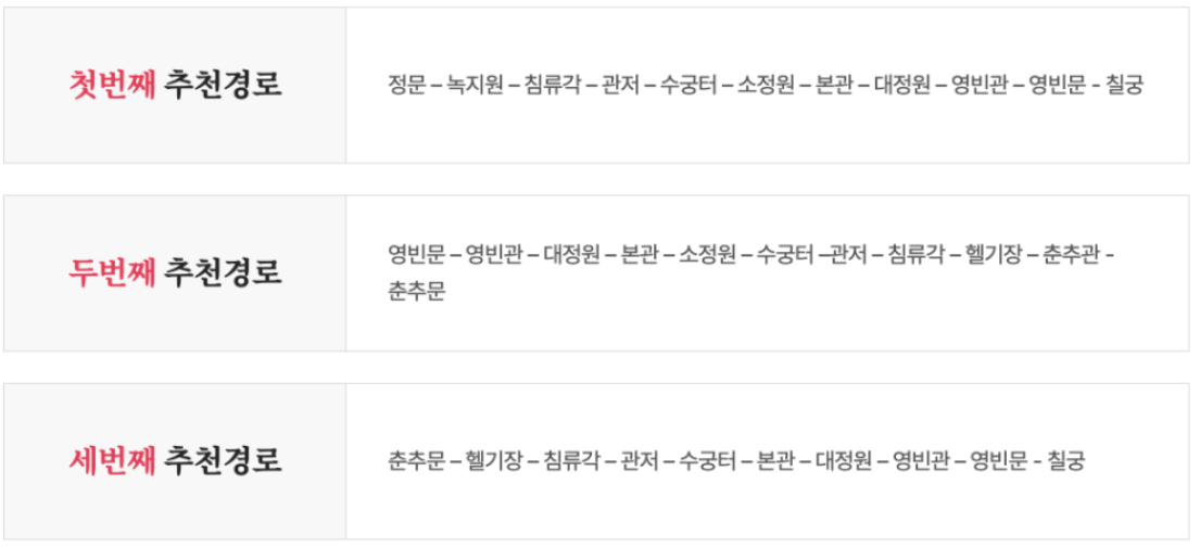 - 출구를 춘추관으로 하고, 입구를 영빈관쪽으로 하는 경로를 추천해본다. 춘추관쪽으로 들어가서 관저나 본관을 가려면 언덕을 힘들게 올라가야 하기 때문인데, 영빈관쪽으로 가게되면 내려가는 길이 된다.