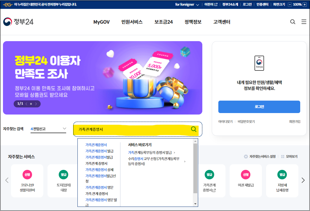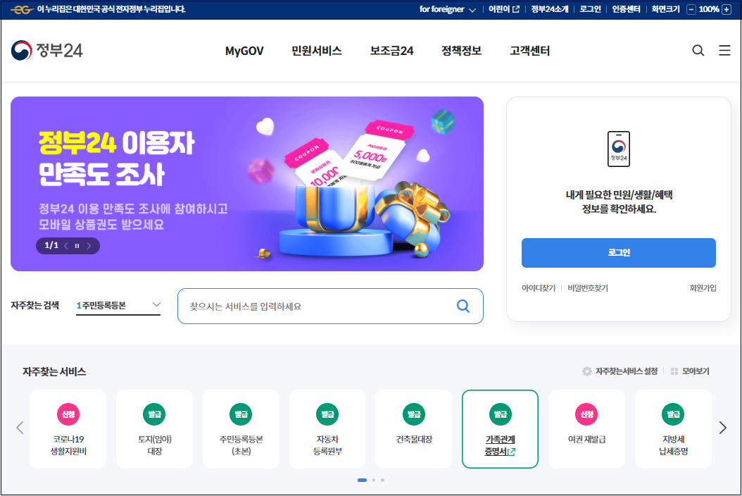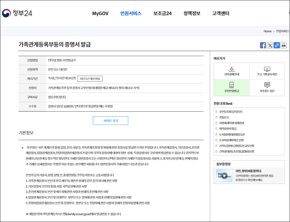 ▲ 인터넷 정부24 민원사이트 통해서 가족관계증명서를 발급받을 수 있어요▲