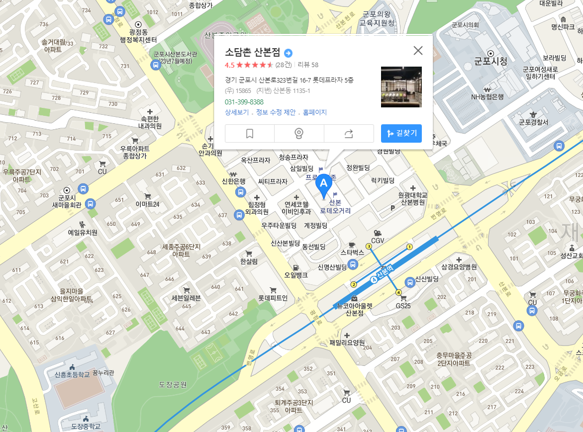 - 4호선 산본역 3번 출구에서 도보로 5분