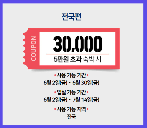 제공 내용 : 전국 어느 지역에서나 5만원 초과 숙박상품 구매 시 3만원 할인권을 제공