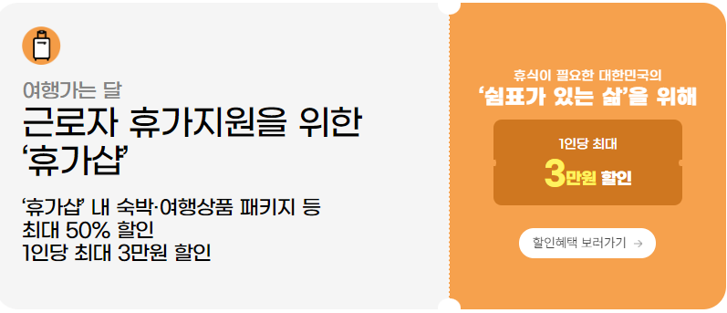 - 본 프로모션은 근로자 휴가지원사업 ‘휴가샵’ 이용자 대상으로 진행됩니다