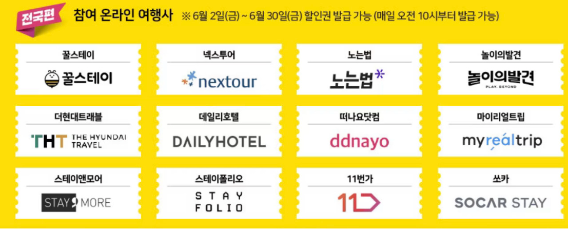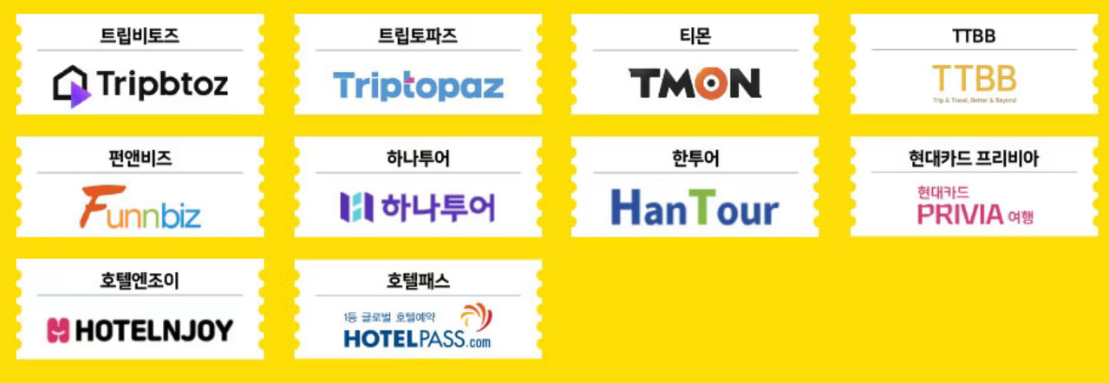 | 참여 온라인 여행사 | 꿀스테이, 넥스투어, 노는법, 놀이의발견, 더현대트래블, 데일리호텔, 떠나요닷컴, 마이리얼트립, 스테이앤모어, 스테이폴리오, 11번가, 쏘카, 야놀자, 여기어때, 오늘밤엔, 옥션, 올마이투어, 웹투어, 위메프, 인터파크, 젲 닷컴, G마켓, 투어비스, 트리플, 트립비토즈, 트립토파즈, 티몬, 펀앤비즈, 하나투어, 한투어, 현대카드 프리비아, 호텔앤조이, 호텔패스 |