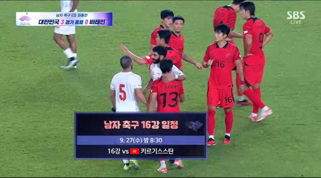 - 오늘 우리가 축구 남자 3라운드 대한민국 vs 바레인 전에 승리해서 태국과 쿠웨이트 전 승자가 조 2위로 16강에 합류하게 되었습니다.