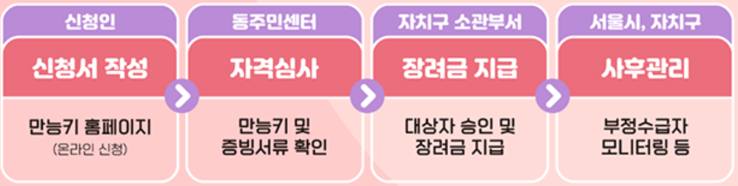 ✔ 매월 15일까지 신청하면 동주민센터 및 구청 담당자가 자격 및 소득기준 심사 후 매월 말까지 개인통장으로 장려금을 지급합니다.