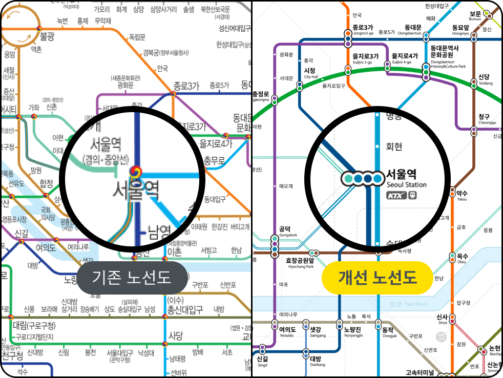 ✔ 새로운 노선도는 환승역을 신호등과 같은 형태로 표시하여 일반역과 잘 구분할 수 있도록 했습니다.