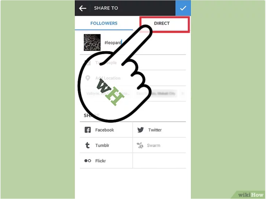 - 하지만 “공유하기” 화면에서 “DIRECT” 버튼을 눌러 다른 사람에게 비공개 메시지를 보낼 수 있다.