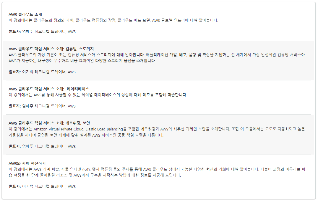 - 총 5개의 강의를 통해 AWS 클라우드의 기초 개념부터